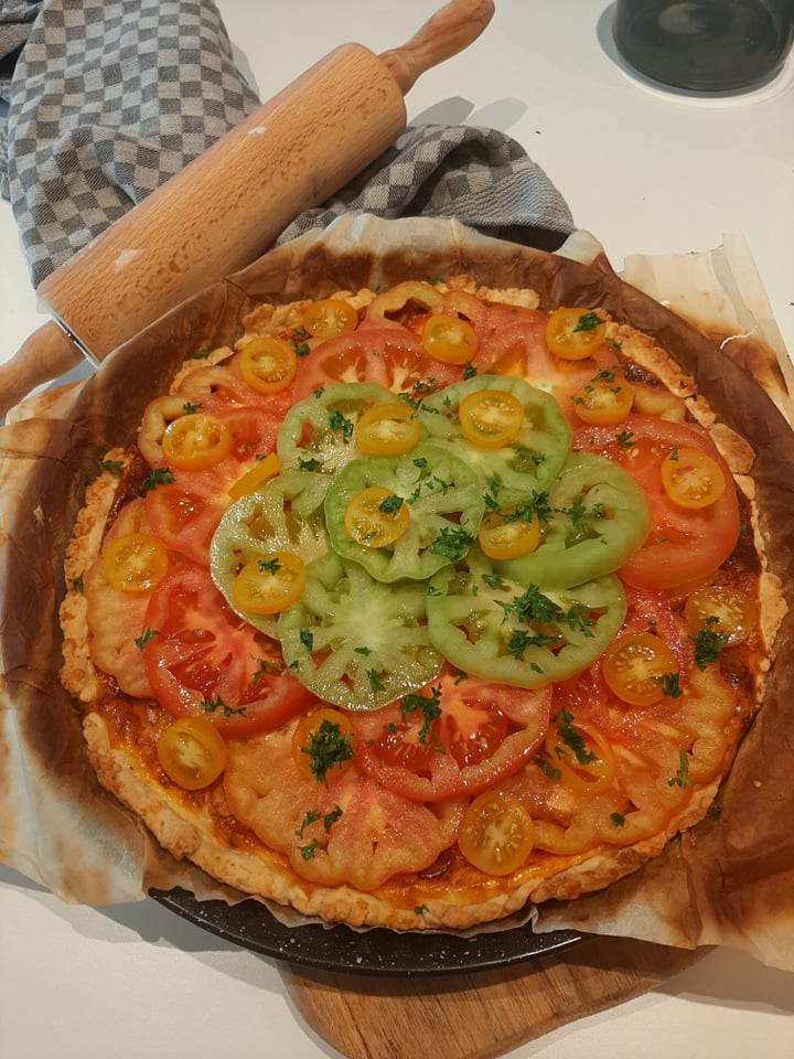 Wanneer je de koude tomaatjes op de warme taart legt heb je een heerlijk frisse toch warme taart.
