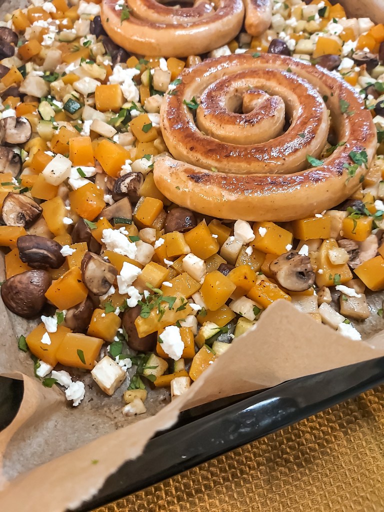 - Bak ondertussen de worst. (Ik gebruikte kalkoenworst, maar hier kan je natuurlijk zelf de keuze in maken).
