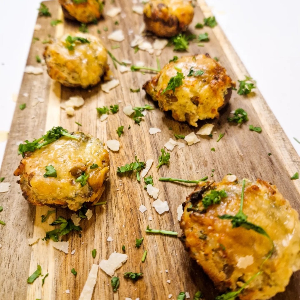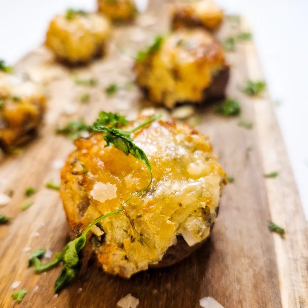 - Leg de champignons op een.bakplaat en vul deze rijkelijk op. Doe er nognwat parmezaan over.
