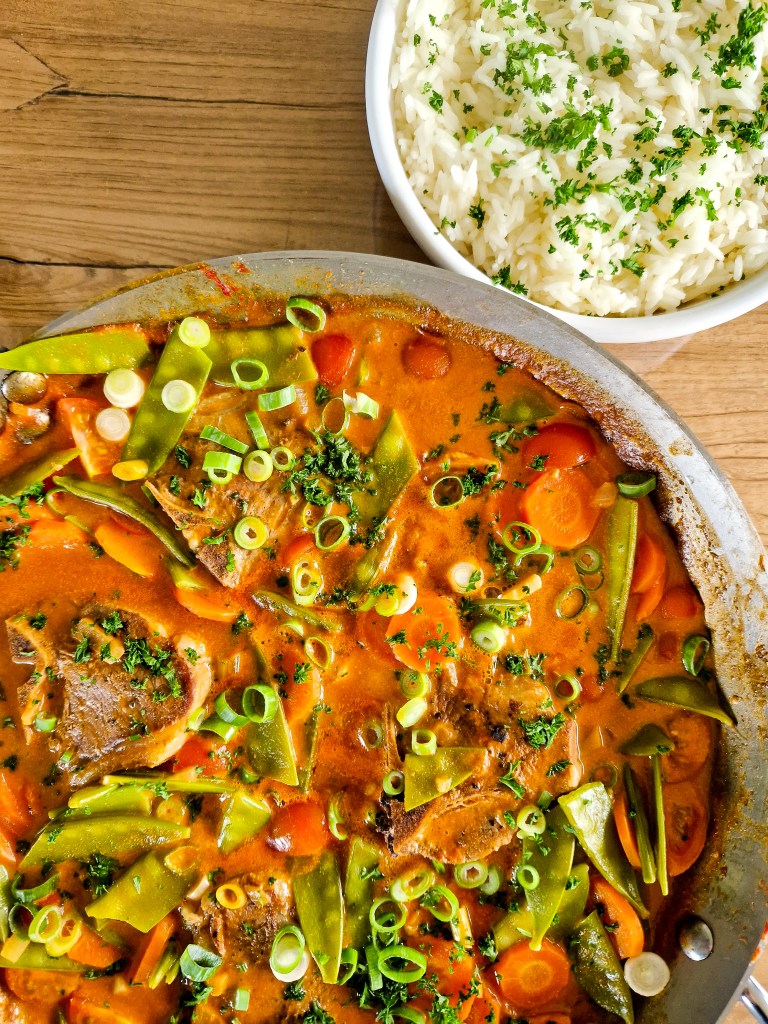 - Verhit een pan met de kokosolie, bak de lam 5-7 min aan. Voeg daarna de look, ui, gember, citroengras, tomatenpuree en curry toe.