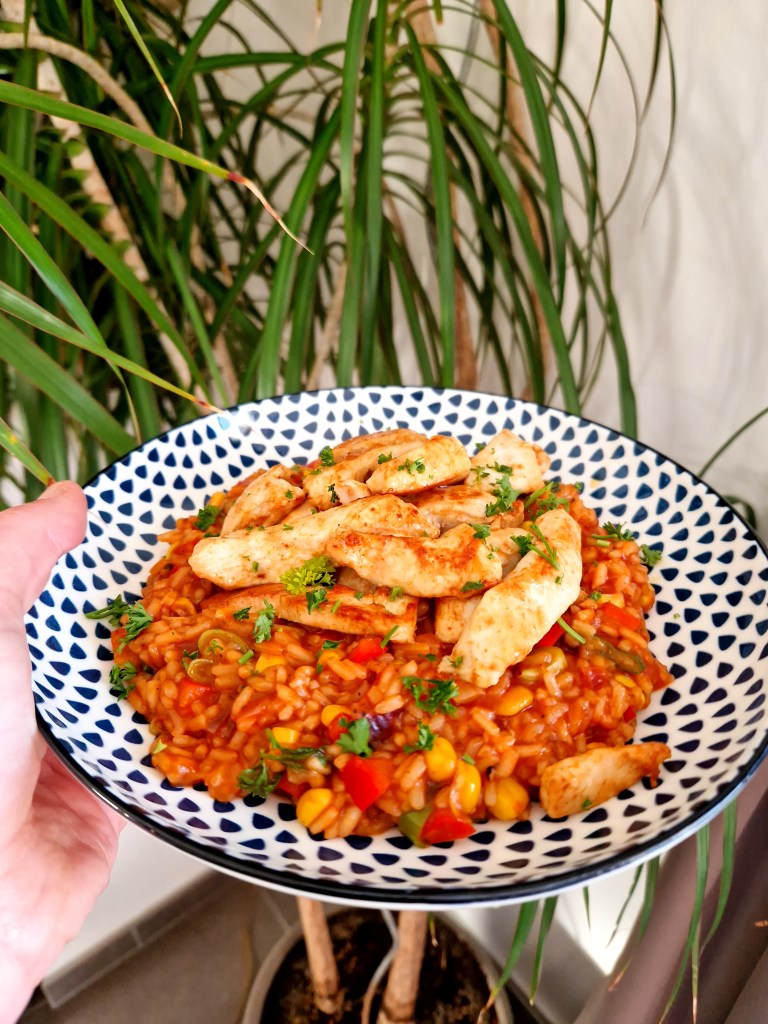 - Wanneer de rijst gaar is, leg je de kip erop en werk af met de peterselie.