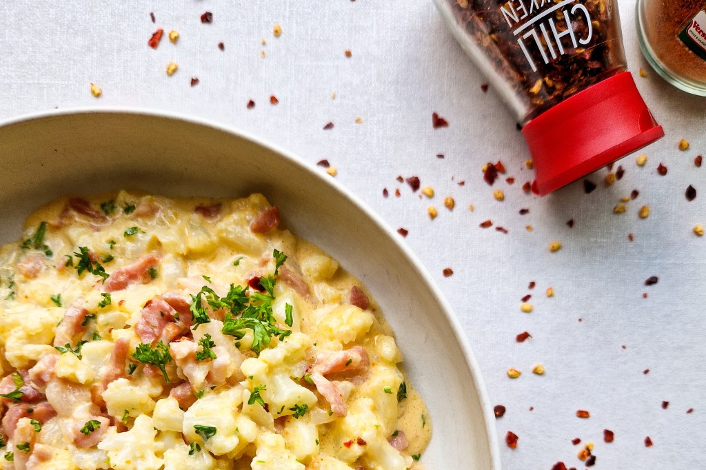 - Smelt in dezelfde pot de room en roomkaas tot een glad mengsel. Voeg de cayennepeper, paprikapoeder, zout, lookpoeder en chilivlokken toe naar smaak.