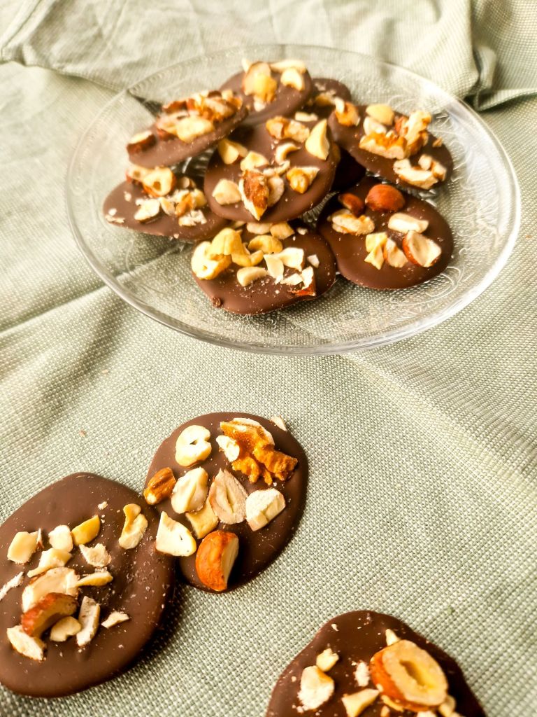 - Hak de noten wat fijn en strooi deze over de chocolade.