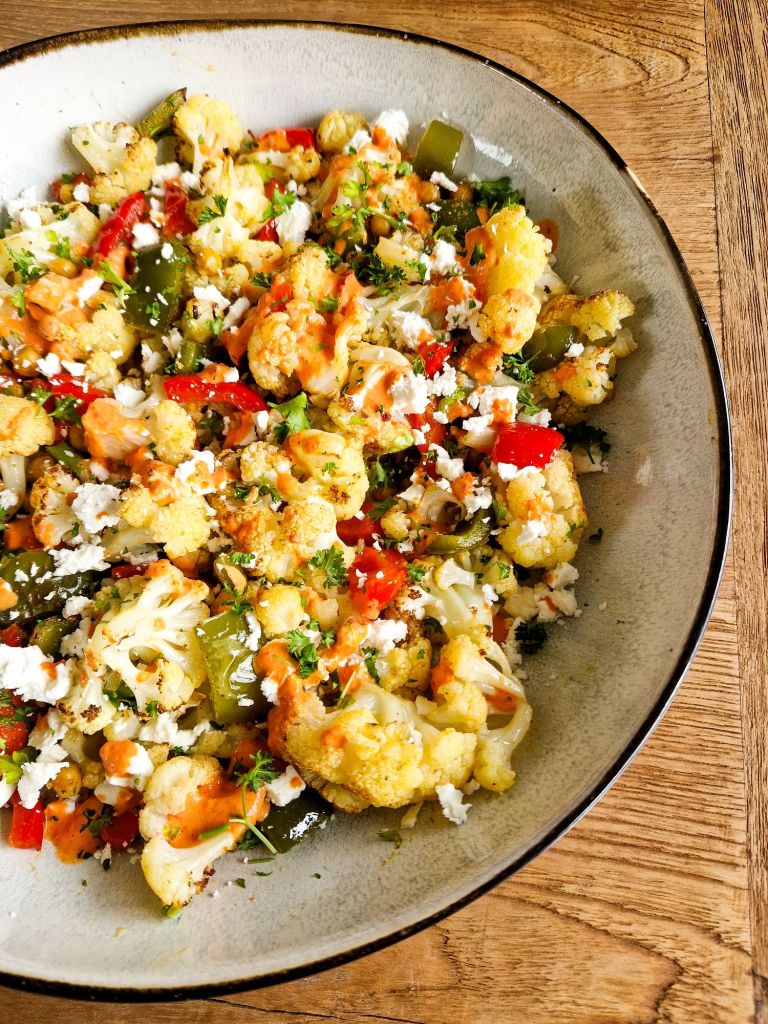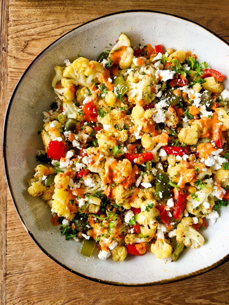 - Doe de traybake in een grote bowl. Voeg de feta, peterselie en lente-ui bij en besprenkel met de dressing.