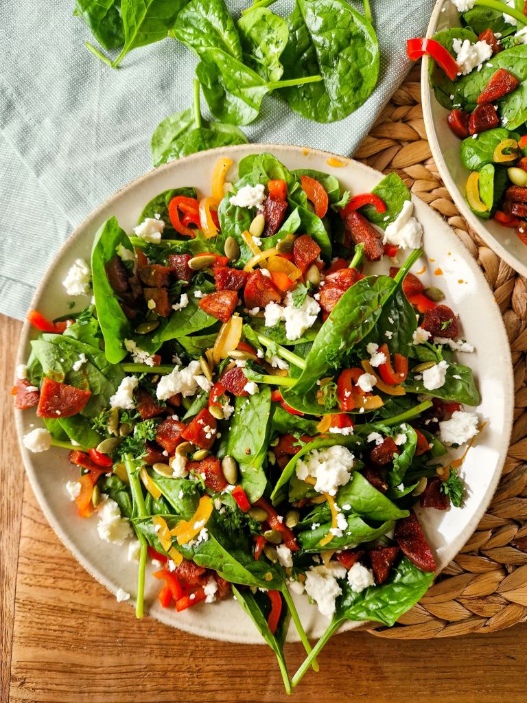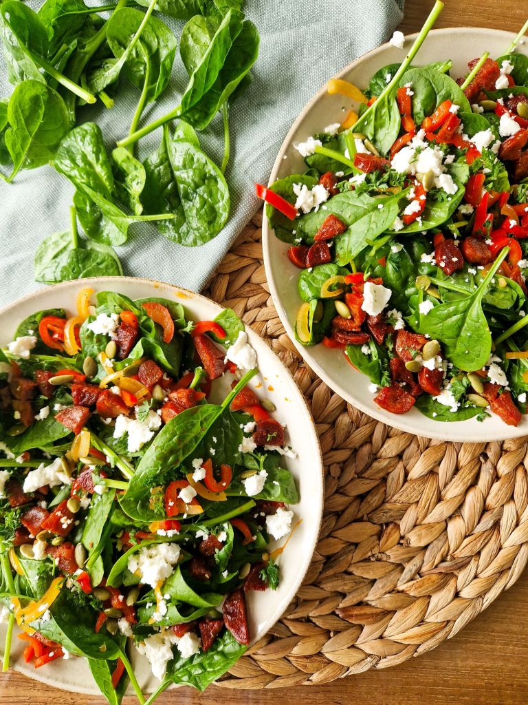 Fris, kruidig en een tikkeltje pittig — deze spinaziesalade met chorizo is pure smaak in elke hap! Met romige feta, knapperige paprika en een vleugje tzatziki is dit het ideale gerecht voor een snelle, smaakvolle lunch of als bijgerecht!