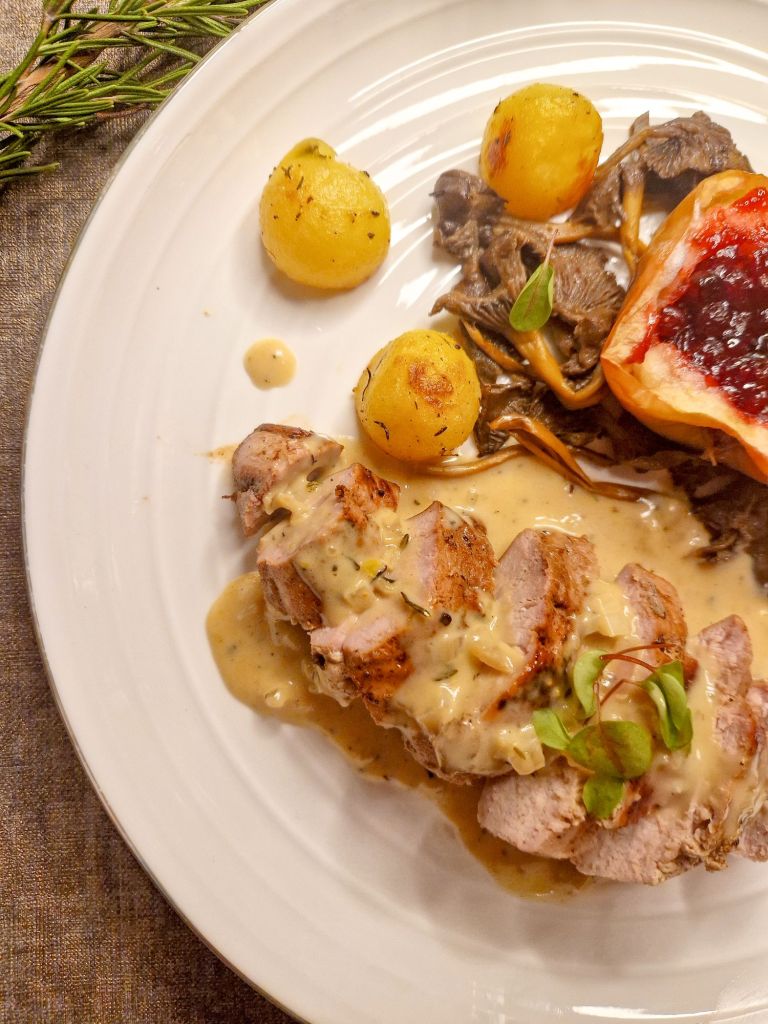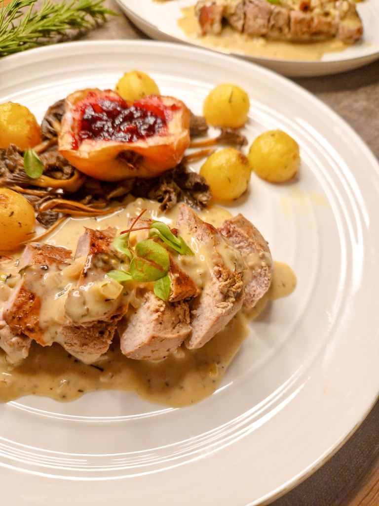 - Halveer de appeltjes en hol ze uit. Vul op met de veenbessencompote. Vet een ovenschaal in en zet de gevulde appeltjes erin. Zet 30min in de oven samen met de aardappeltjes.