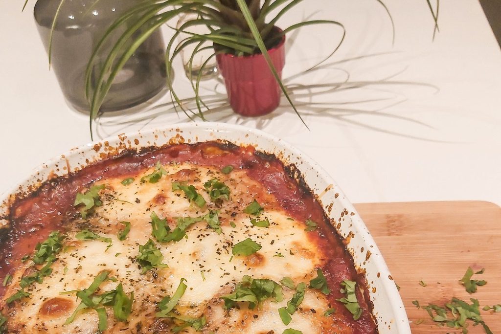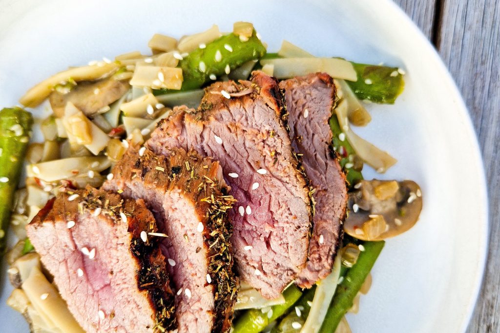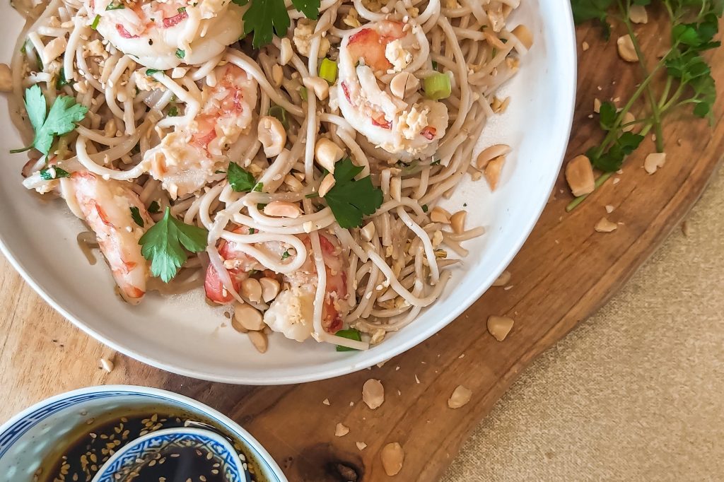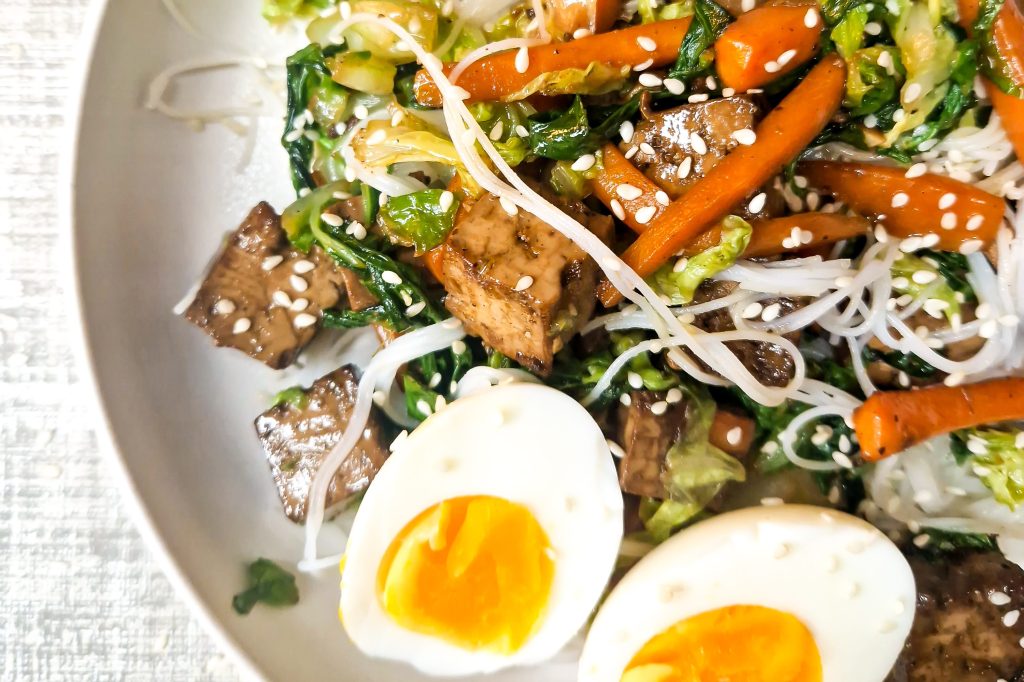Gemarineerde tofu met noedels, gebakken groentjes en een gekookt eitje