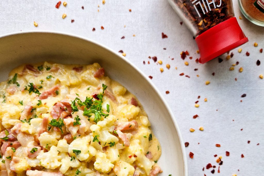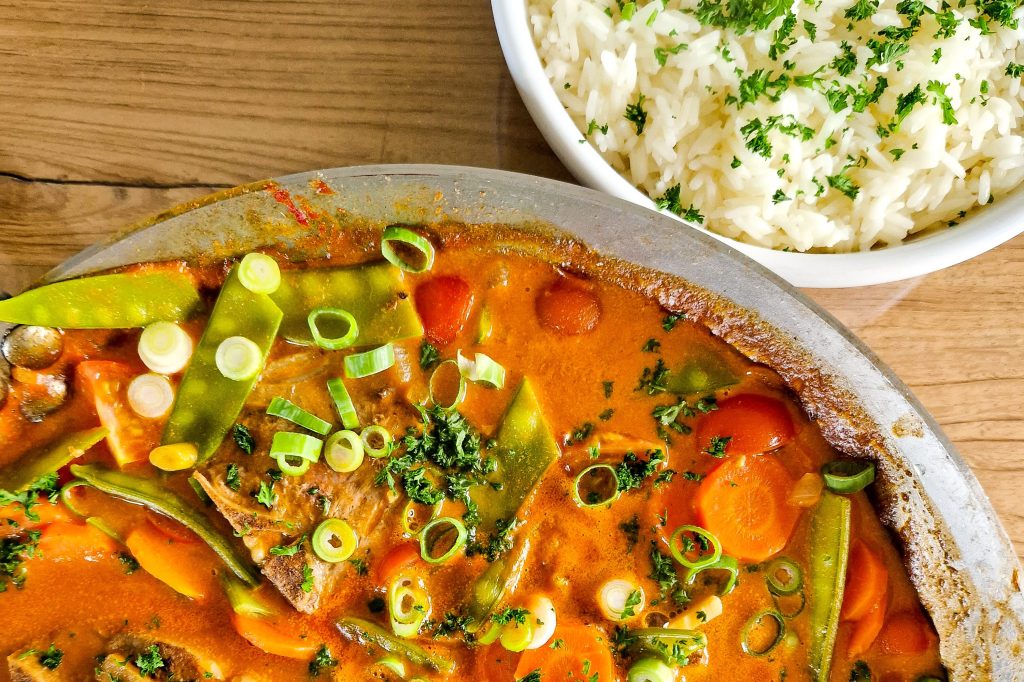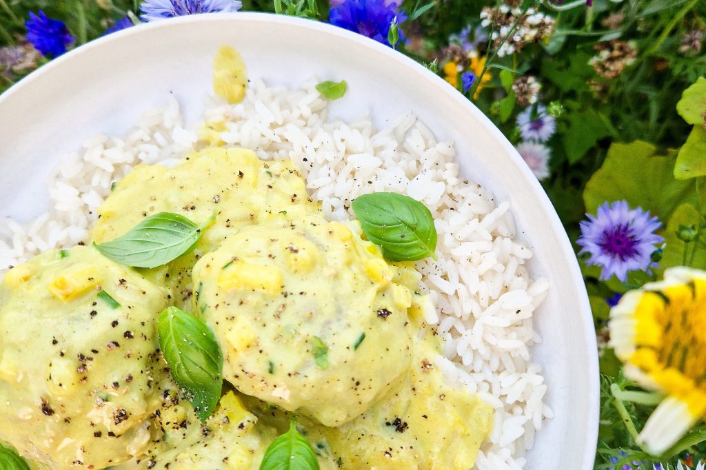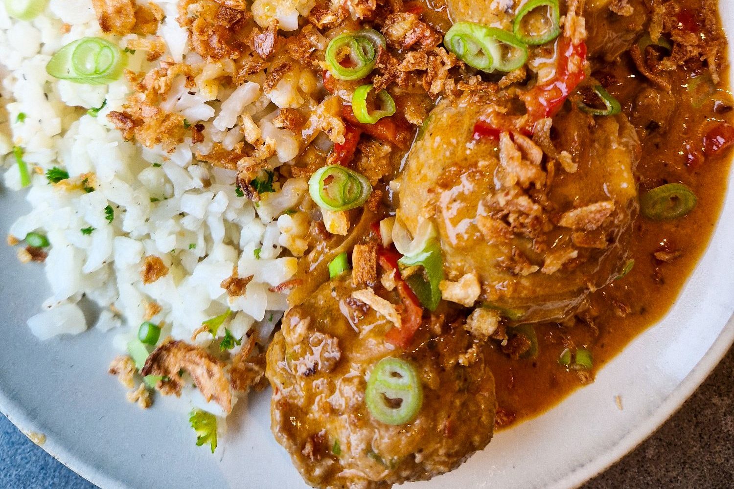 Thaise gehaktballetjes in rode curry en bloemkoolrijst