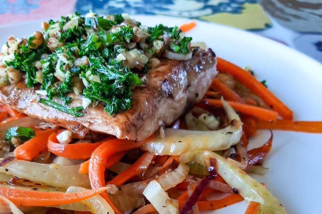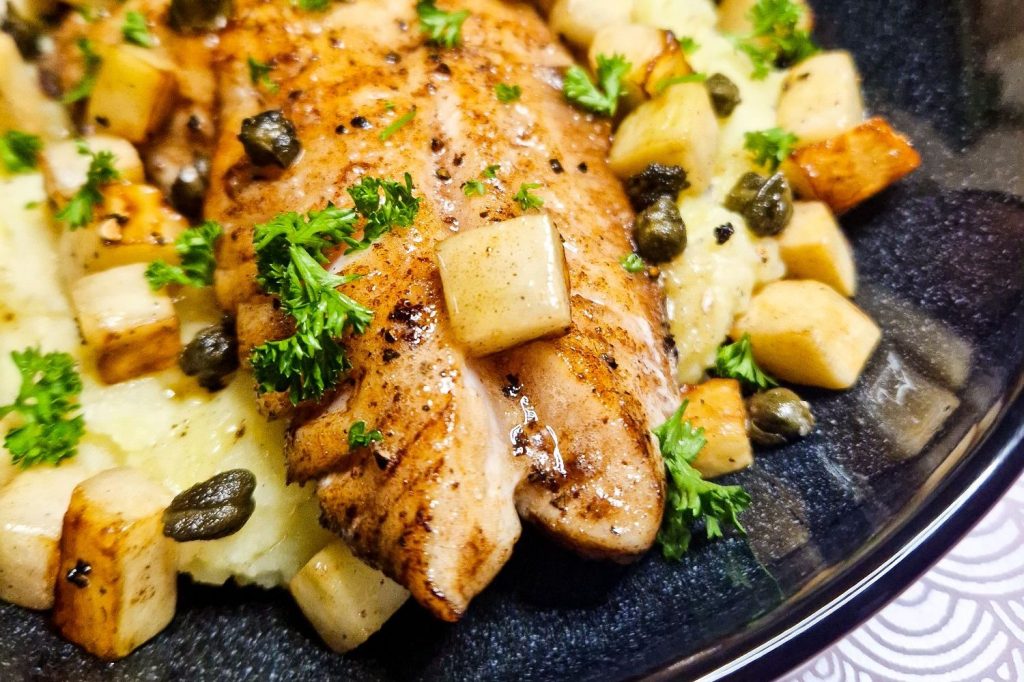 To share: Roodbaarfilet met karnemelkpuree, knolselder, kappertjes en peterselie